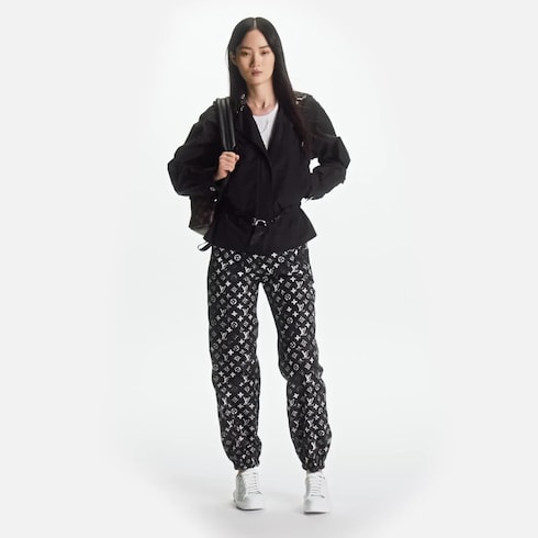 Busana kasual ini menggabungkan kesan sporty dengan signature grafis Louis Vuitton. Dibuat dari bahan technical fabric, busana ini dihiasi dengan motif Monogram yang ikonik milik Rumah Mode, yang diperbarui dengan efek stensil unik. Detail termasuk tutup kait, pergelangan kaki dan pinggang elastis, serta dua saku beritsleting di bagian samping.